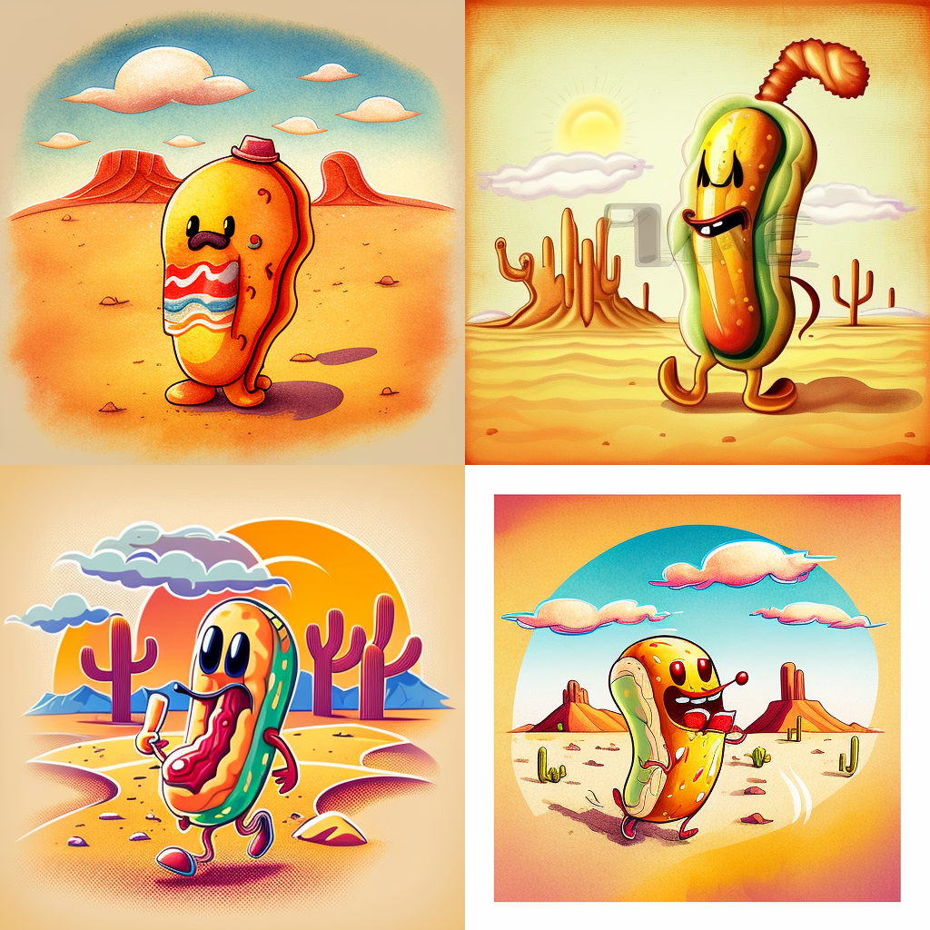 a realstic looking hot dog walking through a desert happy but thirsty, what they carry on them as an adventurer, knolling, illustration, detailed vivid colors and watercolor background